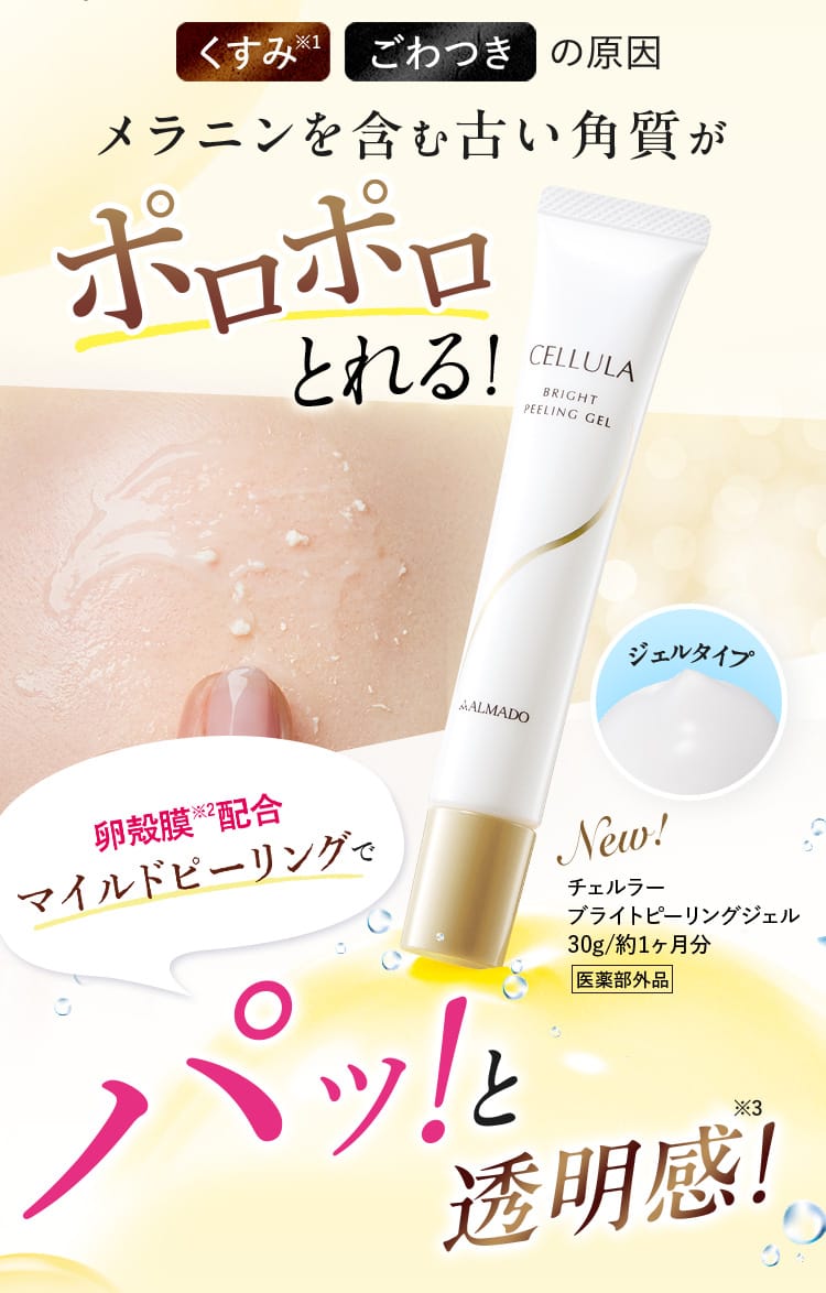 ピーリングと同時にチェルラーの「卵殻膜※」が保湿・ハリ・弾力をプラス アルマードだからできる処方です!