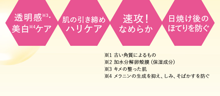 特徴:透明感・美白ケア、肌の引き締めハリケア、速攻!なめらか、日焼け後のほてりを防ぐ。※注釈:※1 古い角質によるもの ※2 加水分解卵殻膜(保湿成分) ※3 キメの整った肌 ※4 メラニンの生成を抑え、しみ、そばかすを防ぐ