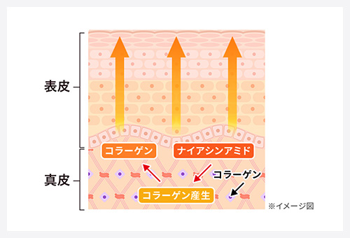 ナイアシンアミドが、真皮でコラーゲンの産生を促し、シワを改善します。