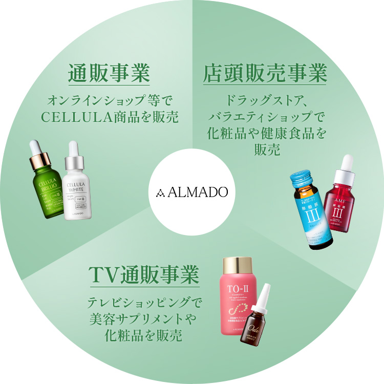 アルマードの事業展開 通販事業を通じてチェルラーブランドにご縁をいただいたお客様が多くいらっしゃいますが、当社はテレビショッピングや店頭販売などでもブランド展開しております。
