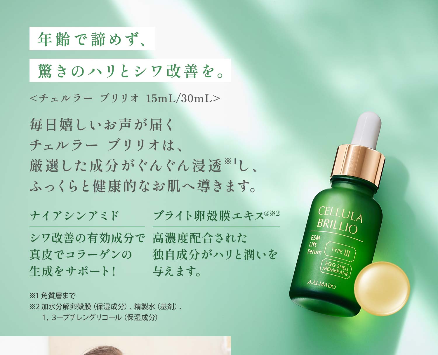 会社がアルマードという名前であること、卵殻膜がお肌にどれだけ良いものか、ということを知りました。偶然SNSで卵殻膜が配合された美容液「チェルラー ブリリオ」を見て、扱っている会社がアルマードであることを知り、定期購入を始めたのです。