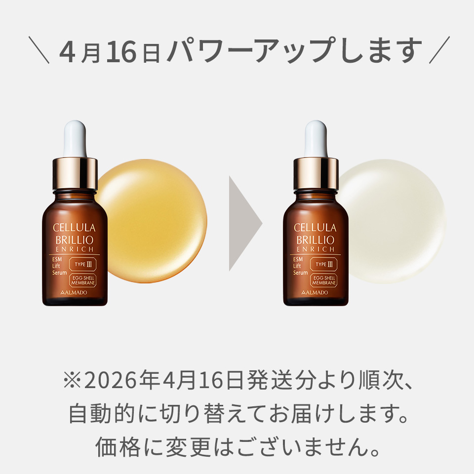 昨月からチェルラーブリリオを、昨日からエンリッチを使っています。「これぞ私が永年求めて来た物」と思う程感動的な使用感です。はずむ肌、そしてリフト効果、とても素晴らしいです。エンリッチは乾燥肌にも嬉しいです。過去に1つで50,000円もするクリームや美容液を使っていた事もありましたが、たいがいはリフティング効果が薄く、ほとんどは広告代なのかと思います。もっと沢山の商品情報欲しいです。